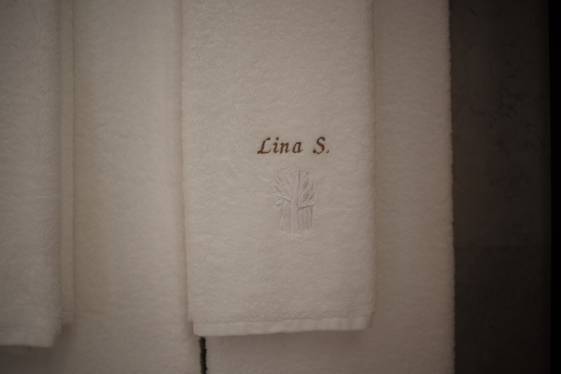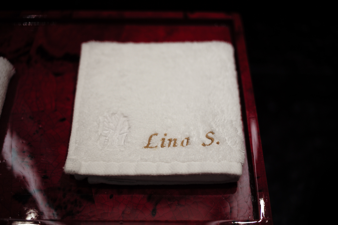 名前の刺繍が施されたタオルやアメニティ。さりげなくも、心に触れるおもてなし。