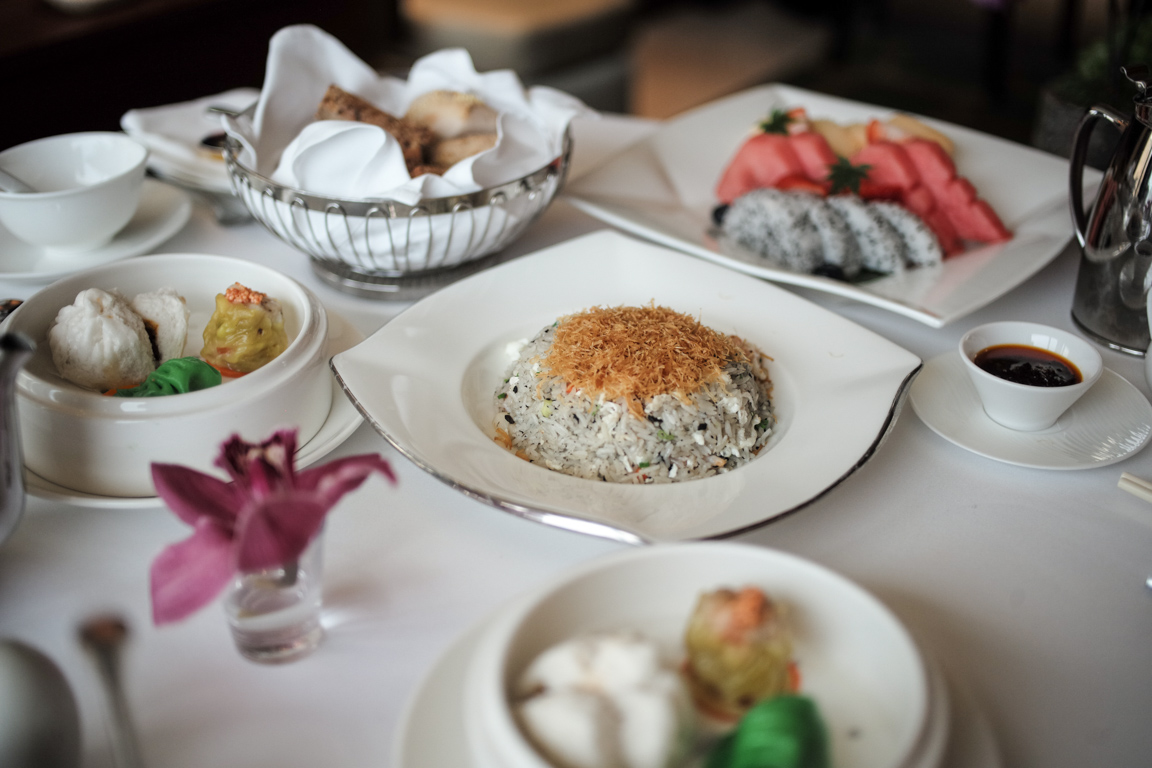 A Chinese-style breakfast served in the quiet glow of morning light — fried rice and delicate dim sum filling the room with warmth,