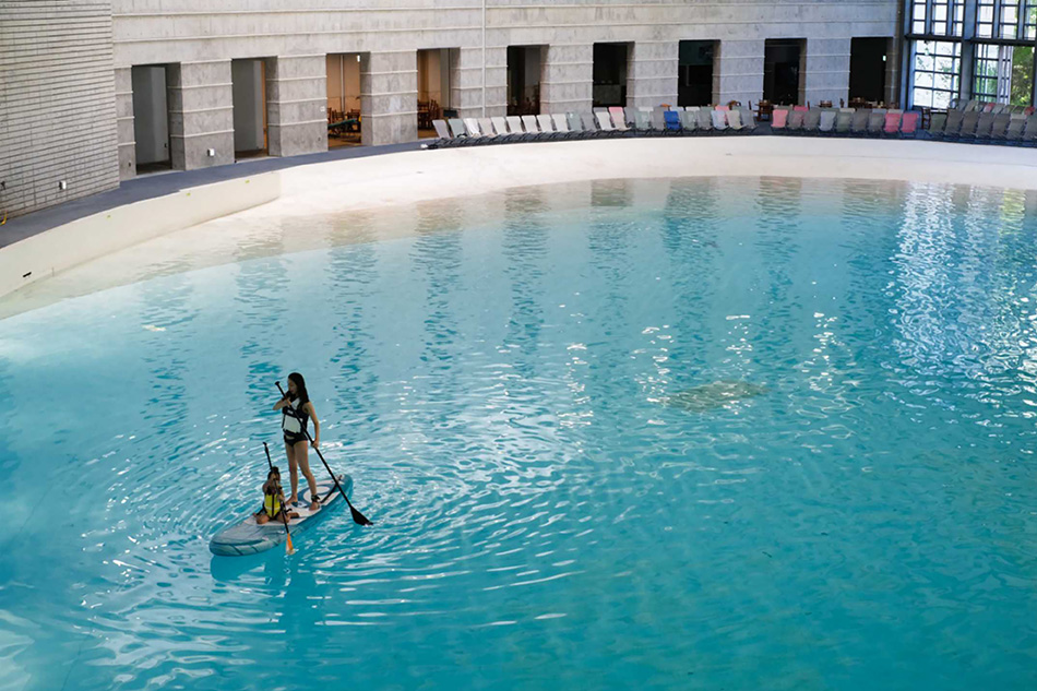全天候型プール「イルマーレ」は、ゆったりと生まれる大波が力強く寄せるプール。家族みんなで水しぶきを楽しみ、笑顔と歓声あふれるひとときを過ごせる。